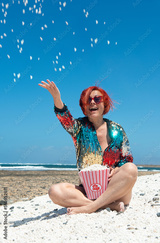 woman in the sun on the sand of Popcorn Beach in Fuerteventura