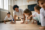 Group of preschool kids and their black female teacher practicing push ups during exercise class.