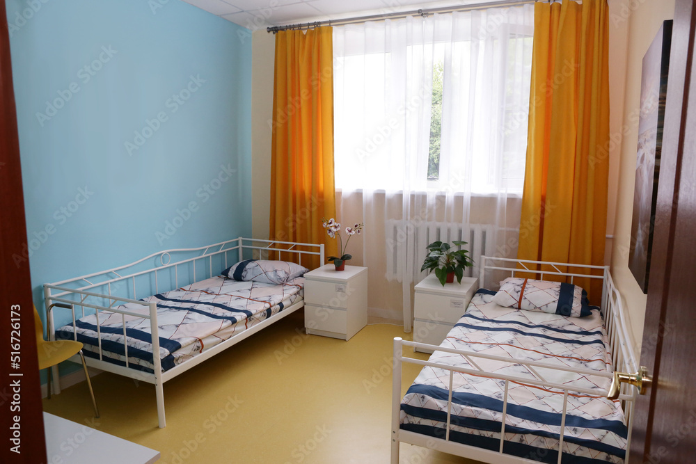 interior corner of hospital for elderly people ward with bedside table and curtain close up photo