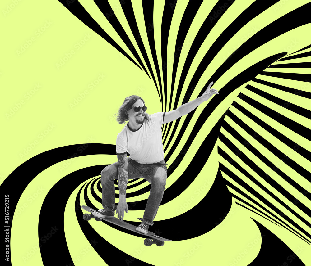 Skateboarding on hypnotic pattern background. Contemporary art collage. New ideas and creative inspiration. Concept of retro vintage style. optical illusion elements