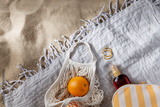 leisure and summer holidays concept - bag of oranges and sunscreen oil on beach blanket