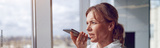 Office business concept.Portrait of handsome mature woman with mobile phone recording voice massage.