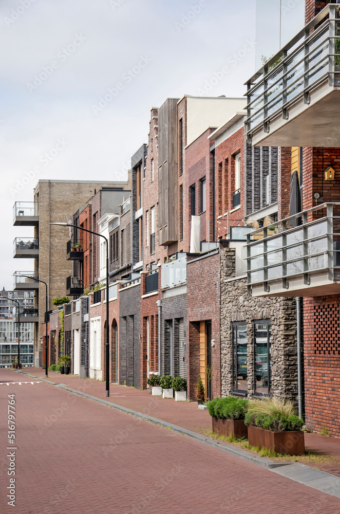 Dordrecht, The Netherlands, April 15, 2022: modern canal houses with individual facades in various colors
