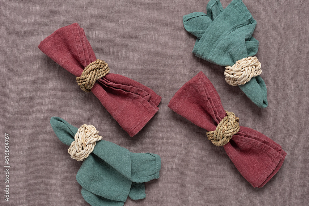 Colored linen napkins with natural rings on a linen tablecloth. Top view, flat lay. The concept of natural eco fabrics.