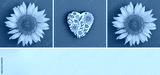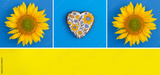 Collage of sunflower and gingerbread in the form of heart on the colored background. Copy space. Top view.