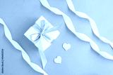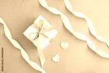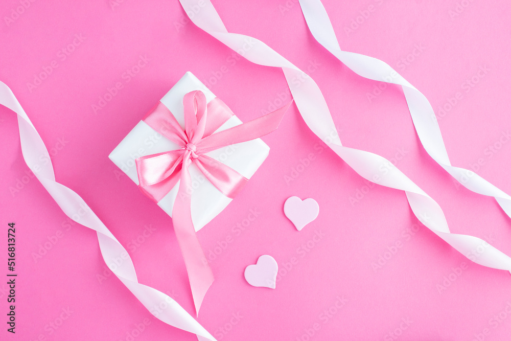 Gift box with tied pink bow, ribbon and two pink hearts on the pink background. Closeup. Top view.