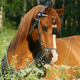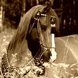 Portrait of chestnut arabian horse with perfect harness