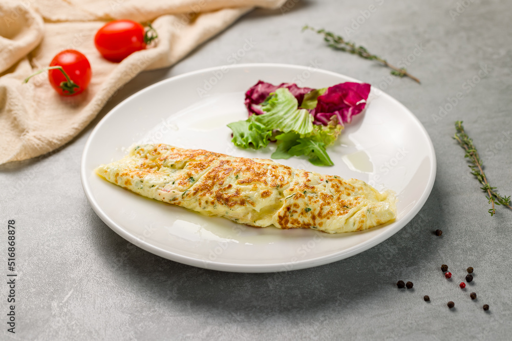 omelette breakfast on a white plate with mix salad on grey table