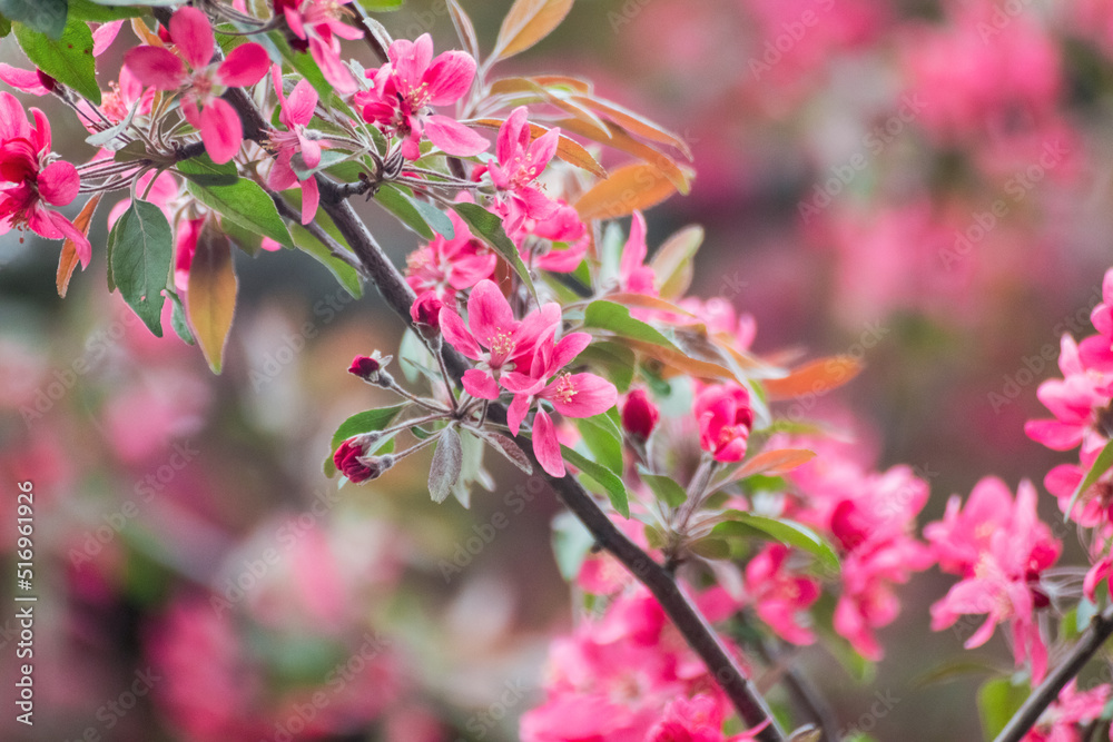 Pink apple tree blossom, big flowers on branch. Apple tree spring delicate vibrant pink flowers bloom in garden close-up with blurred background