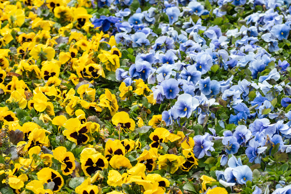 Vibrant yellow and blue Viola Cornuta pansies flowers close-up, floral background with blooming colorful heartsease pansy flowers with green leaves