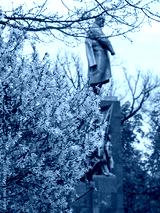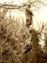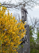 Forsythia or Yellow Bells bush bloom near blurred Taras Shevchenko Monument in Kharkiv city center park. Spring yellow flowers in Shevchenko City Garden