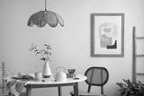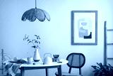 The stylish dining room with round table, rattan chair, wooden commode, pock up poster and kitchen accessories. Beige wall with mock up poster. Home decor. Template.