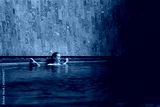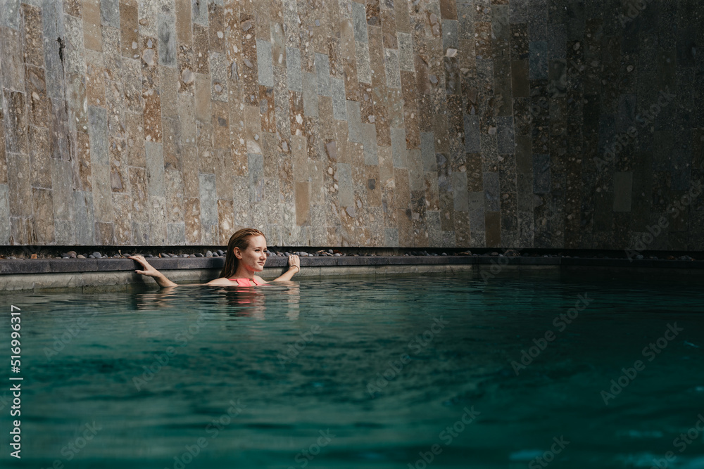 Woman Swimming Alone in Modern Luxury Pool. Minimalist Travel Escape with Calm Water and Textured Stone Wall