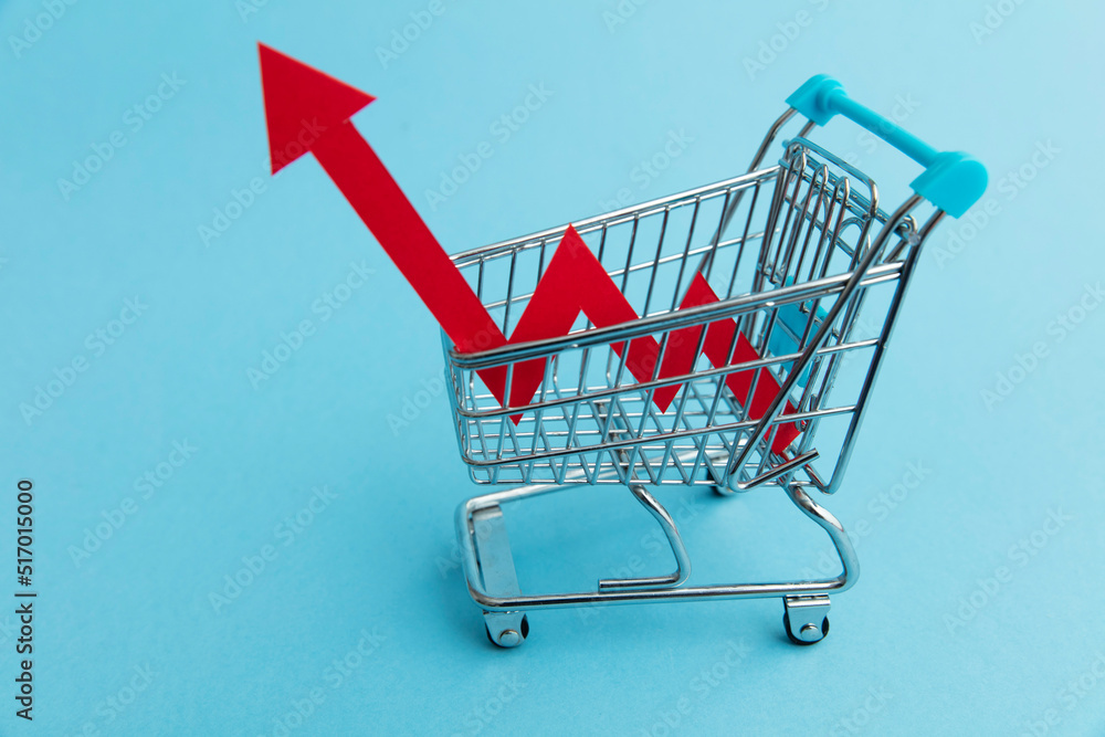 Rising cost of shopping. Shopping cart with red inflation arrow