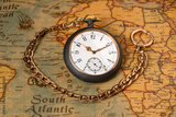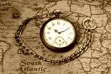 Vintage silver watch with gold chain lying on an old paper map. Round gray vintage clock with golden hands on yellow world map. Concept of travel, time, adventure. Geography, countries and continents.