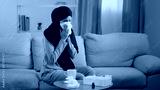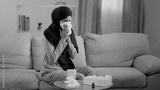 Sick arabian muslim young unhealthy woman in hijab suffer from runny nose flu disease seasonal allergy sneeze blow nose in paper napkin symptoms of coronavirus drink hot tea sit at home self-isolation