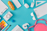 Top view of school supplies on pastel blue background. Creative study idea, flat lay. Minimal back to school concept.