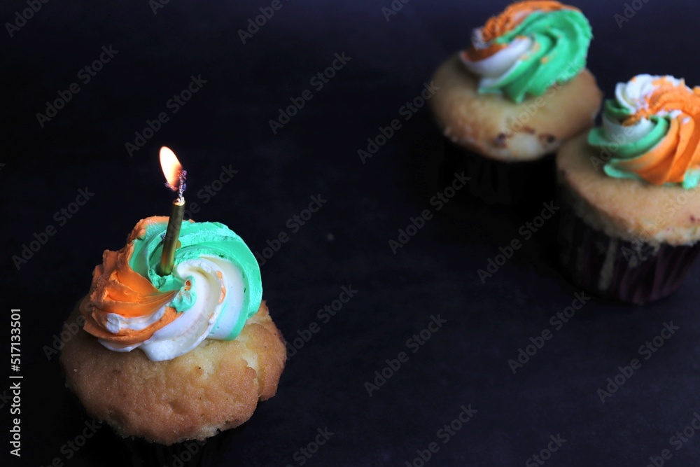 Tiranga Cupcake or Tricolor Cupcake with Indian National Flag colors frosting. saffron or orange, white and green. The concept for Indian happy Independence or Republic day greeting card. copy space.