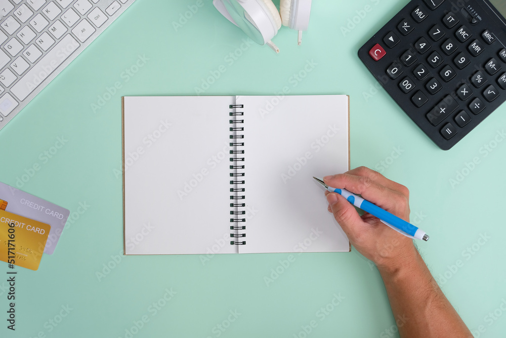 Man writing on a blank page of a notebook at a white, minimalist office desk. frontal and flat views