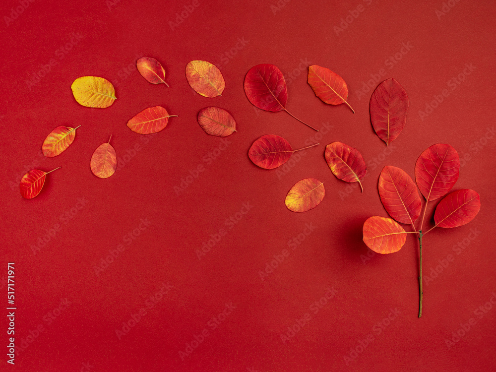 Minimalist composition of red fallen leaves forming symbolic autumn tree and windy weather. Autumn forest or Thanksgiving holiday background. Top view, flat lay, copy space for text.