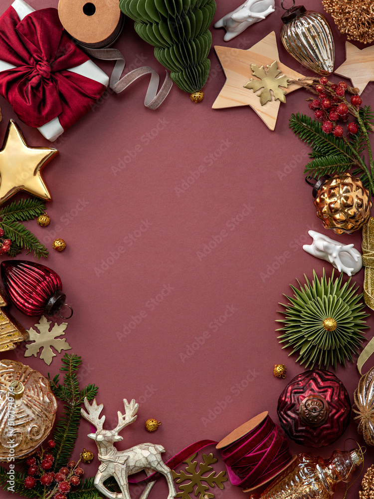 Festive Christmas frame design for your invitation, greeting card or website banner. Winter holiday background made of fir branches, gift boxes, vintage decorations and baubles.