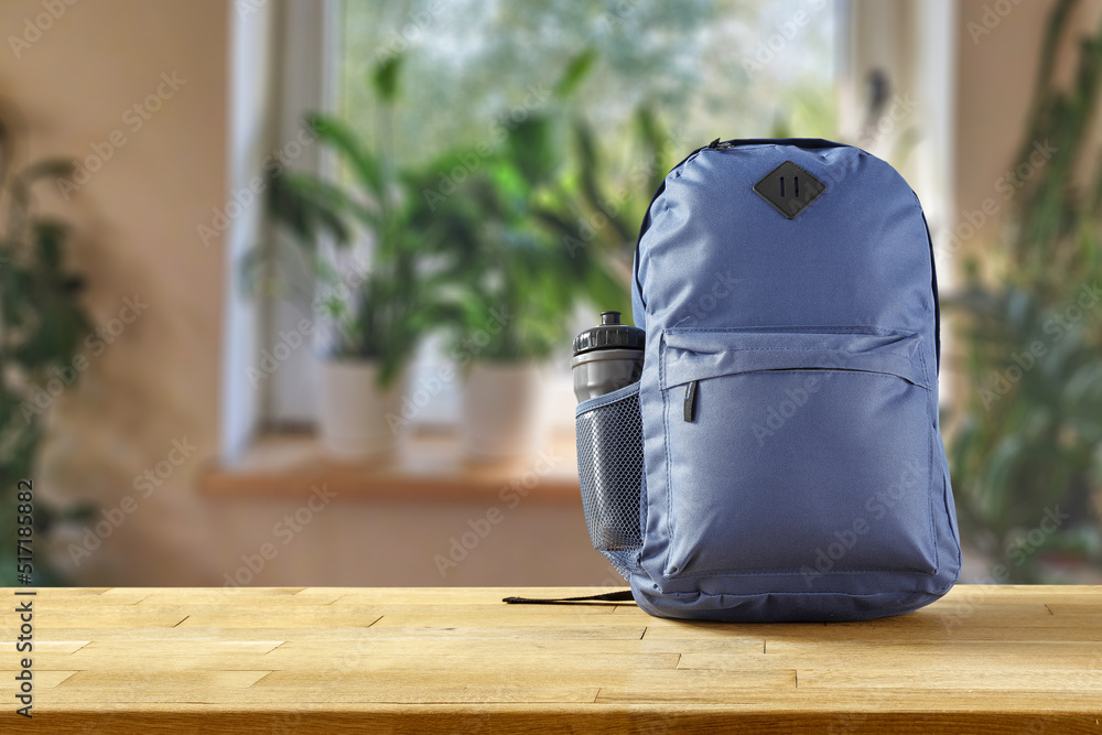 Schoolbag on table and blurred window with green plants.