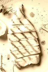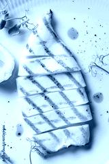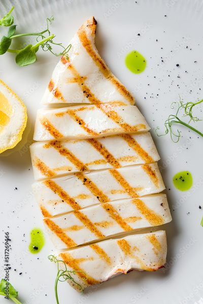 Roasted squid with lemon and greenery on a white plate macro close up top view