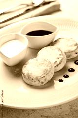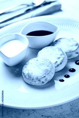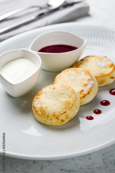 cheesecakes from cottage cheese with sour cream and raspberry sauce on white plate, vertical