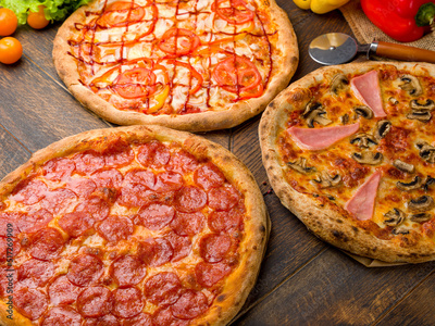 Pepperoni pizza with cheese, pizza with ham and mushrooms, pizza with chicken, tomatoes and bbq sauce on wooden table