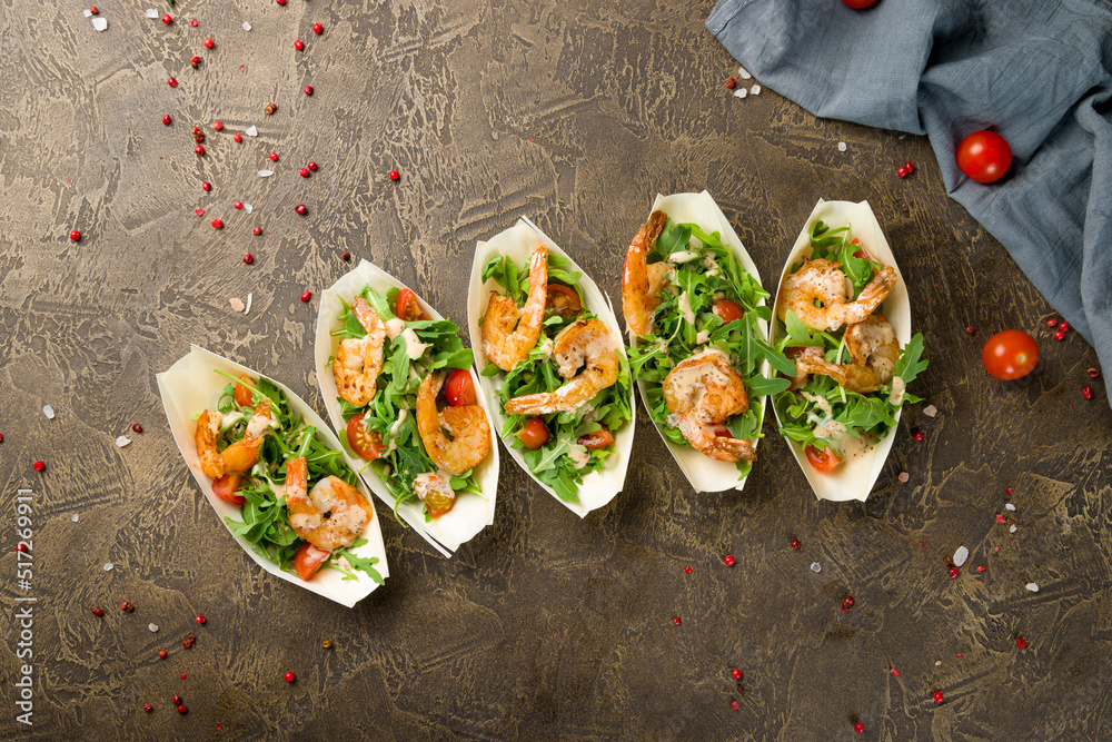 Arugula with shrimps, tomatoes and parmesan, canapes