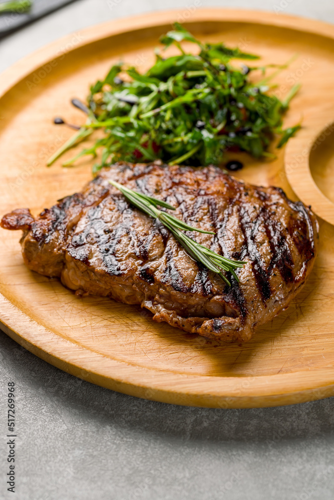 juicy Ribeye steak on wooden plate with aragula, tomatoes and pepper sauce vertical macro close up