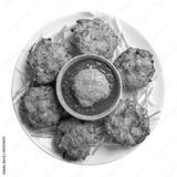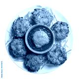 Mix veg pakora with tomato mint sauce isolated on white background top view