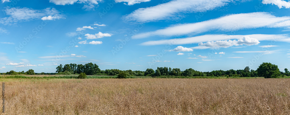 Pole uprawne w okresie wzrostów, jasna pogoda nieznacznie pochmurna, szeroki krajobraz