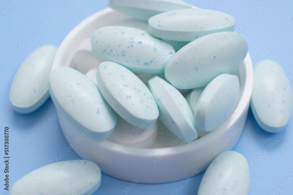 Top view macro of pill and pill spilled from pill bottle with copy space