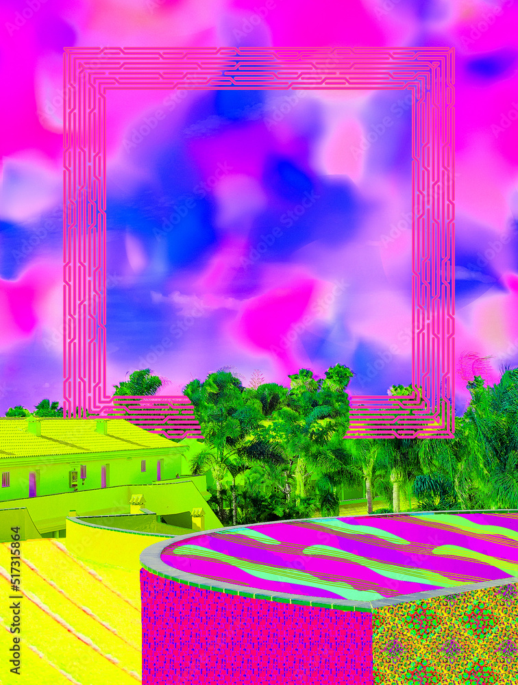 Contemporary digital collage art. Palm, tropical texture and geometry mix. Fashion zine design