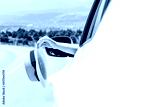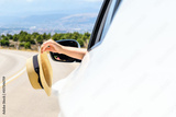 Woman driving a car holding straw hat from the open window. Trip on the serpentine road in the mountains. Summer vacation