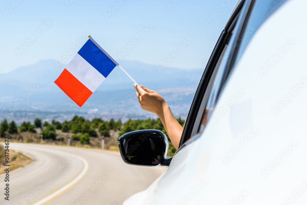 Woman holding France flag from the open car window driving along the serpentine road in the mountains. Concept