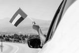 Woman holding United Arab Emirates flag from the open car window driving along the serpentine road in the mountains. Concept
