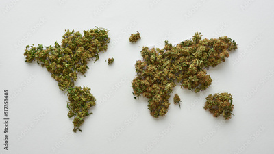 World map from marijuana buds on white background