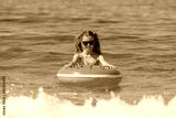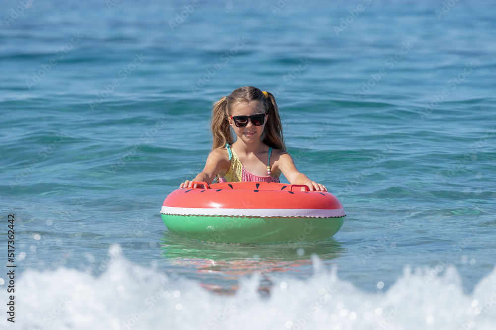 A young girl swims on an inflatable ring in the sea.
