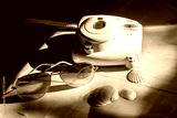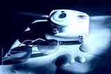 Horizontal selective focus still life with a summer vacation vibe, including retro style camera, turquoise sunglasses and shells on wooden background