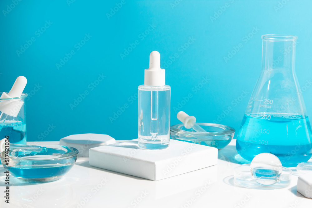 scientist and mockup tube bottle for skin care cosmetic , product branding, cream lotion treatment, laboratory room testing experimental