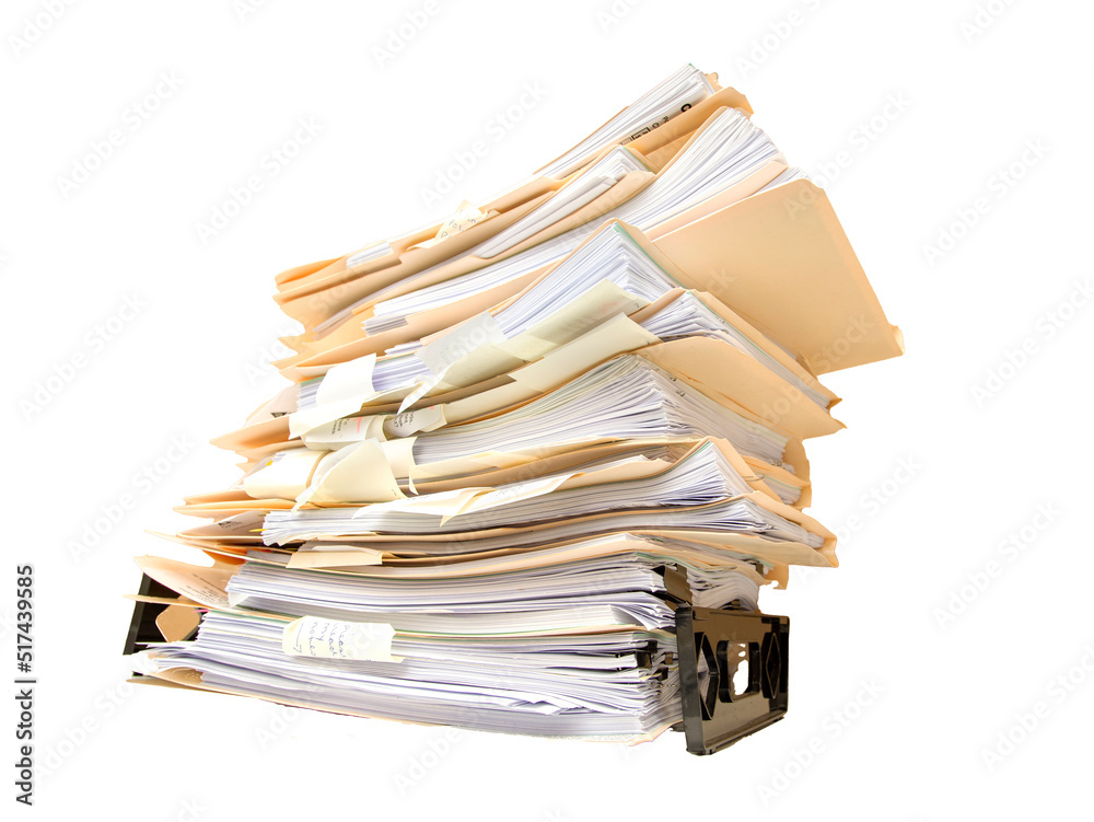 Manila folders stacked overflowing an in box at an office on a white background