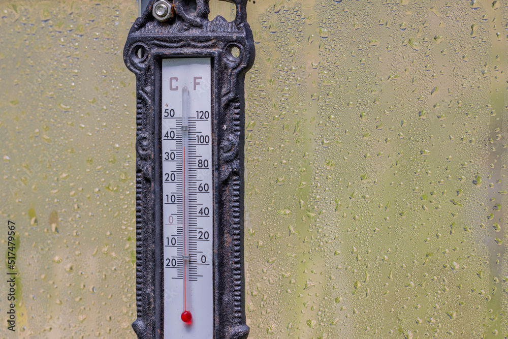Close up view of thermometer showing air temperature in greenhouse with drops of condensate on windows on summer day. Sweden.