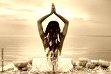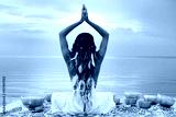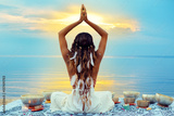 Yoga Meditation at Sunset Beach. Peaceful Woman relaxing with Tibetan Singing Bowls. Indian Women Silhouette meditating over Sunshine Blue Sky background