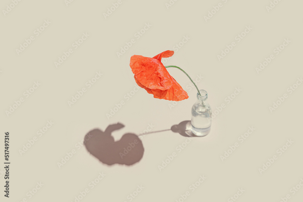 Red poppy flower in glass vase on pastel sunlit background with shadows. Nature concept. Minimal style.