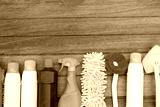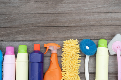 House cleaning plastic product on wood table background, home service or housekeeping concept