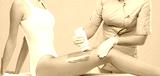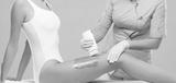 Beautician is removing hair from young female body and legs with hot wax. Woman has a beauty treament procedure. Depilation, epilation, skin and health care concepts.