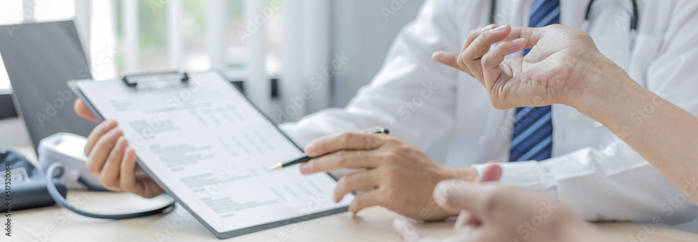 Male doctor made a diagnosis on a male patient and gave advice on treatment methods in the hospital examination room, Helping patients with medical advice, Health care counseling.