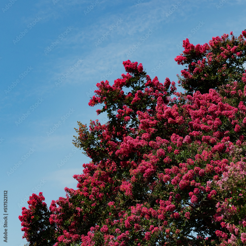 Vibrant pink crepe myrtle tree in full summer bloom against a blue sky with copy space